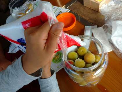紀州といえば梅が有名です。冷凍した梅に砂糖を加えて、梅ジュースを作っていきます。毎日、入れ物を振ると少しずつとけてきて、おいしい梅ジュースができるそうです。