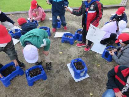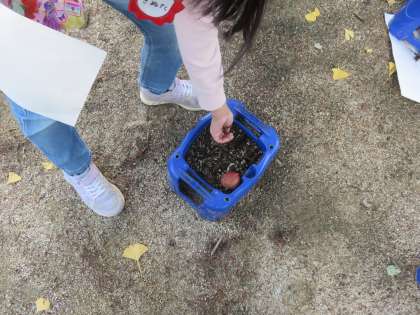 あさがおを植えていた鉢にチューリップの球根を植えました。春にはきれいな花が咲くといいですね。