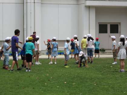 5年生は中庭で英語の学習をしていました。“What time is it Mr wolf?”というゲームで、子ども達はオオカミと羊に分かれます。羊が“What time is it Mr wolf?”と聞き、オオカミが(例えば)“It's six o'clock.”と言うと、羊は6歩オオカミに近づきます。羊が近くまで来てオオカミが“It's dinner time.”と言うと、羊をつかまえに走ります。そこで羊はタッチされたら食べられるというゲームです。子ども達はゲームに夢中になって、楽しみながら時間に関する英語を学習しました。【発信:教務 北風】