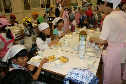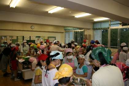 生涯学習ルームや天王寺区食生活改善推進員協議会、天王寺区保健福祉センターや大阪夕陽丘学園短期大学の皆さんのご協力を得て、午後3時から3・4年生対象のクッキング教室が家庭科室で開催されました。