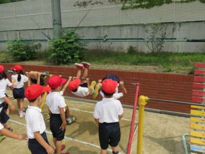 梅雨の真っ最中ですが、今日は運動場で体育をすることができました。1年生は、鉄棒・うんてい・中当てをしていました。鉄棒は前まわりや逆上がり・コウモリなどの技を練習していました。うんていでは、最初から最後までぶら下がって行くのは難しいですが、前に進んでいくと「やったー」「すごい!」など歓声が上がっていました。【発信:教務 北風】