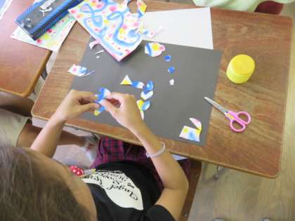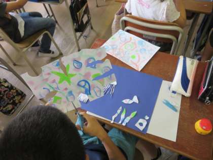6時間目、3年2組は図工で貼り絵をしていました。まず、画用紙に水を塗ってから絵の具で模様を描くと濃淡ができます。それをすきな形に切り取って貼っていきます。子ども達は魚やお城など好きな形に切り取って、個性的な作品がたくさんできていました。【発信:教務 北風】