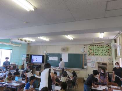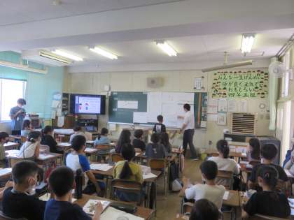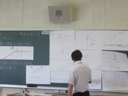 今日は4年生で算数の研究授業がありました。180°より大きい角度はかり方について考え、個人やグループ、全体で考えを深めましました。180°や360°の角度に着目して角度を求める意見が多く見られました。