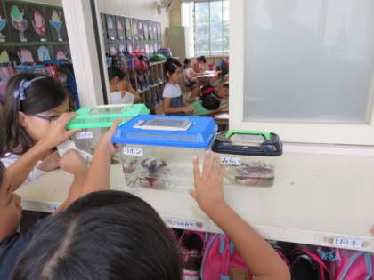 2年生は生活科の学習でザリガニを飼育しています。2年2組ではザリガニの観察と水かえをしていました。子ども達はグループごとに「ポッター」「リボン」「みらい」と、ザリガニに名前をつけて、「今日は元気よく動いているね。」など毎日のザリガニのようすを班で話して大切に飼育していました。【発信:教務 北風】