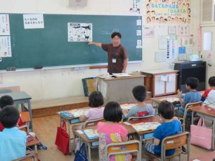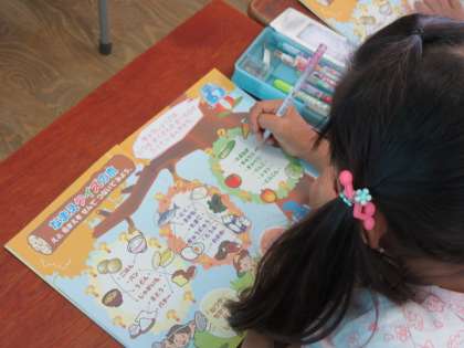 今日は栄養教諭による1年生の栄養指導がありました。食べものの絵と名前を線で結んだり、野菜がどのように木になっているのかシールを貼って確かめたり、食べ物クイズをしたりしました。栄養指導は初めてでしたが、子ども達は給食などでふだん食べている食べものについて楽しく学ぶことができました。【発信:教務 北風】