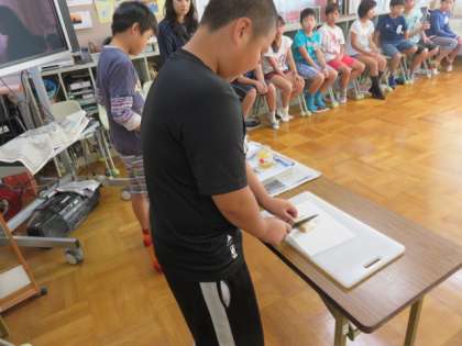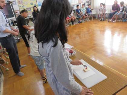 6年生は英語の学習でサンドウィッチを作りました。子ども達は"Please tell me how to make it."とみんなで問いかけると,“Scoop the jam.”(ジャムをすくう)“Spread the jam.”(ジャムをぬる)“Cut the bread.”(パンを切る)“Put the slice on top”(上にのせる)と英語で言いながらサンドウィッチを作り,最後はみんなで食べました。単語の意味を動作化することで楽しみながら学習することができました。 【発信:教務 北風】