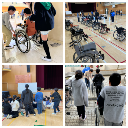 1月19日(金)22日(月)に、3年生の総合的な学習の時間の取組で車いす体験を行いました。実際に車いすを利用されている方のお話を聞かせてもらった後、車いすの使い方を学び、講堂付近のスロープなどのコースを体験しました。歩いていても気づかないような僅かな段差や坂道でも、車いす移動では気を付けることがたくさんあることに気付きました。