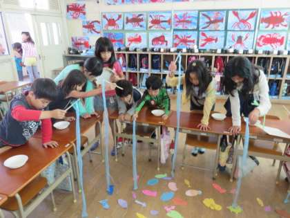 1・2時間目にゲーム集会がありました。班ごとにゲームを考え、今月初めから朝の時間を使って準備をしてきました。子ども達は前半・後半に分かれて店番と回るグループにわかれて活動しました。縦割り班にわかれているので、6年生が中心となって店番をしたり、ゲームを楽しんだりして、異学年との交流を深めることができました。【発信:教務 北風】