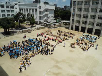 今日は、150周年のお祝いの行事の1つとして、航空写真撮影を行いました。1〜3時間目まで使って、「全体集合写真」「学年集合写真」「人文字航空写真」とたくさんの写真を撮りました。