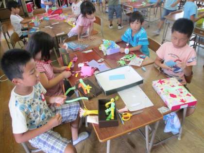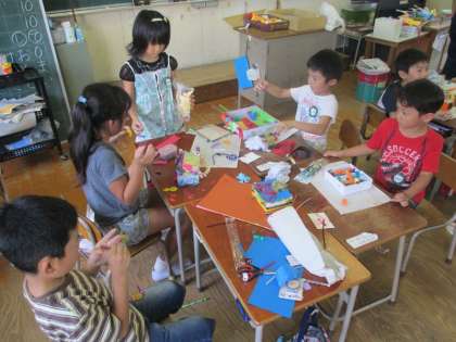 図工の時間に「うきうき ぼっくす」作りをしました。子ども達は紙を折ったり、丸めたり、切ったり色々工夫してオリジナルの箱を作りました。【発信:教務 北風】