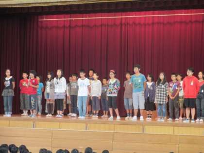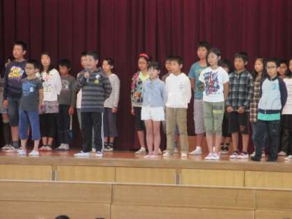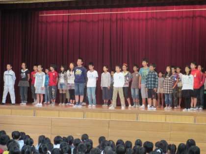 後期の運営委員と代表委員の児童が木曜集会で抱負を発表しました。「あいさつ隊では、大きな声で元気よくあいさつをするので、よろしくお願いします」「ゲーム集会では、みんなが楽しめるようなものにしたいです」など後期に向けて、力強さを感じる発表でした。【発信:教務 北風】