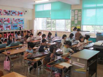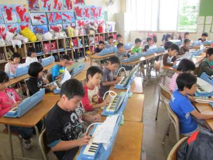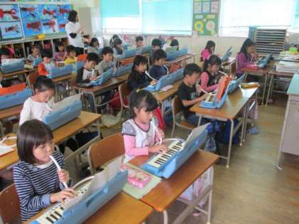 「生命の息吹」という曲を各パート(木琴・鉄琴・オルガン、鍵盤ハーモニカ・打楽器)にわかれて練習をしました。3連符やシャープなどが出てきて1年生の時よりも、難しい曲ですが先生の指導をよく聞いて、上手に演奏ができるようになっていました。【発信:教務 北風】