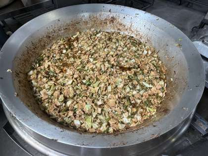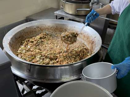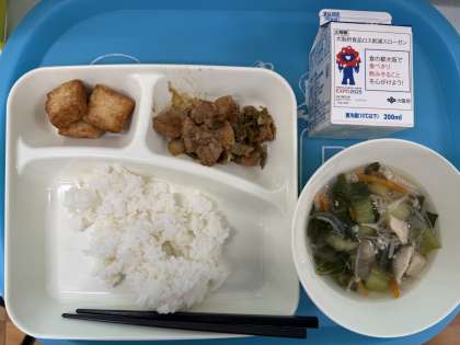 給食のホイコウローは豚肉のばらの部分を使い、炒める前に一度下茹でし、余分な脂を落としてから、キャベツやピーマンと一緒に調理しています。
