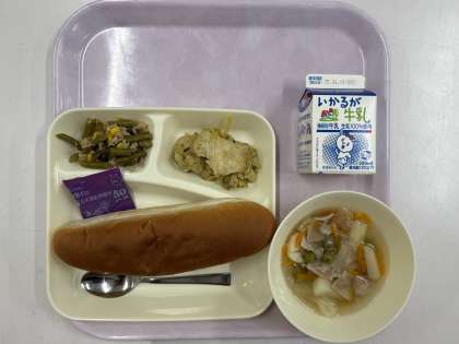 「鶏肉のカレー風味焼き」は大きめの鶏肉に塩・こしょう・ガーリック・カレー粉・綿実油で下味をつけ、たまねぎを混ぜ合わせ、焼き物機で焼きました。カレー粉の風味がしっかりして、子どもたちにも好評でした。