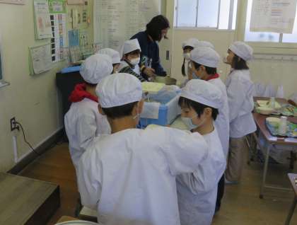登校時には、児童会の児童と一緒にあいさつをして登校してくる子ども達を迎えました。管理作業員といっしょに校舎のペンキ塗りをしたり、教室では学級の子ども達といっしょに給食の準備をしいっしょに食べたりもしました。また、卒業して以来久しぶりに味わう給食をおいしく食べていました。子どもたちも先輩が来たことに喜んでいました。明日ももう一日職場体験があります。