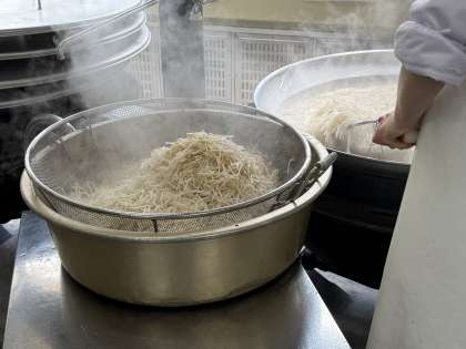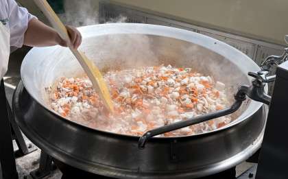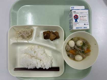 給食では、豚肉・うずら卵・キャベツ・たまねぎ・にんじん・たけのこ・ピーマン・しいたけの8種類を使っています。