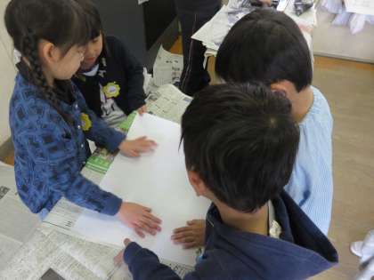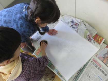 1年生は図工科の学習で紙版画をしています。1年2組では今日、版画を刷る作業をしていました。先生が紙にインクをつけ、それを子どもたちが協力してバレンでこすったり、できた作品を運んだりしていました。テーマは恐竜で、いろいろな模様の恐竜ができました。この後、クレパスを使って背景などを仕上げていきます。できあがりは27日の土曜授業で掲示する予定です。【発信:教務 北風】