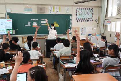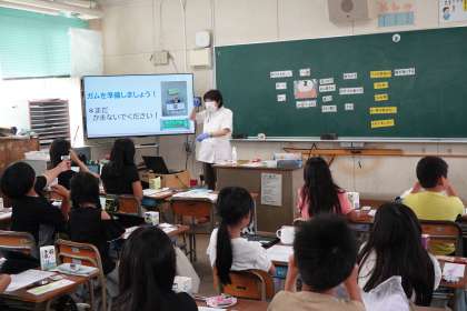 4年生の児童を対象に行った『フッ化物洗口』の様子を紹介します。歯科衛生士さんに来てもらい、歯の健康について学習しました。