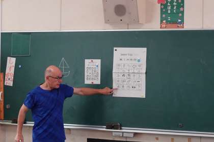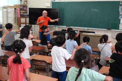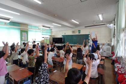 1・2年生の各教室で、外国人の講師の先生といっしょに英語の学習をしました。