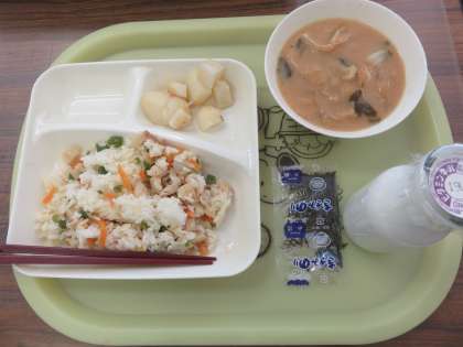 今日の給食は「かやくごはん・みそしる・やきじゃが・牛乳」でした。『たまねぎはいろいろな地方でとれて、貯蔵もきくので、一年中出回っています。中でも、春に収穫するたまねぎは、新たまねぎといわれ、皮がうすくて柔らかく、甘みがあり、辛みが少ないのが特徴です。』(給食カレンダーより)給食カレンダーは各クラスの教室にあり、今日の給食に関する豆知識が書いてあります。
