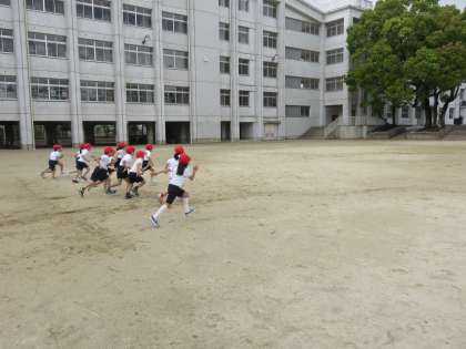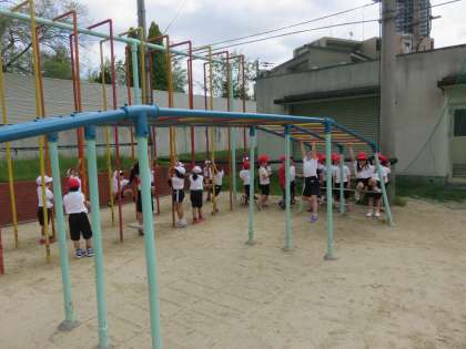 1年生は3時間目に5クラス合同で体育の学習をしました。運動場にある遊具の使い方やきまりについて学んだ後、実際に鉄棒でぶら下がってみたり、のぼり棒、うんていなどにのぼってみたり、すべての遊具に挑戦しました。他にも運動場でかけっこもし、子ども達は思い切り体を動かしていました。【発信:教務】