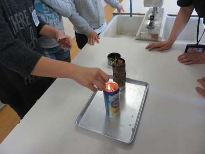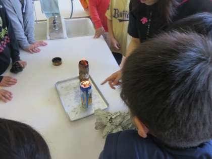 6年生は理科の学習で「ものを燃やすくふう」について学習しています。今日はどんなときに木がよく燃えるのか、穴を開けていない缶と開けた缶の中で割り箸を燃やして、燃え方のちがいを観察しました。マッチに火をつける経験も最近では少なくなってきていますが、子ども達は自分たちで火をつけて、燃え方のちがいを観察し話し合いました。【発信:教務】