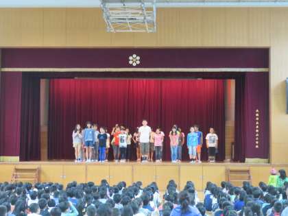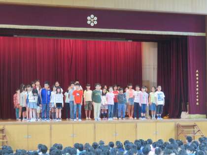 今年初めての木曜集会があり、運営委員・代表委員・各委員会の委員長が講堂で抱負などを発表しました。「あいさつ隊では、元気よくあいさつするので、みなさんも元気よくあいさつしてください。」「代表委員は3回目なので、今までの経験を生かしてがんばります。」「みんなが楽しいと思える学校にしたいです。」など、堂々と発表する姿に頼もしさを感じました。【発信:教務】