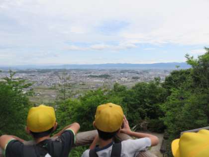5年生は遠足で奈良県の二上山に行きました。當麻寺でクラス写真を撮った後、二上山ふるさと公園に行きました。そこから山頂まで456段の階段があり、みんなで頂上まで登りました。頂上から見える景色はとてもきれいで、子ども達も気持ちよさそうでした。その後、昼食を食べて芝生広場でクラスごとに遊びました。天気が心配でしたが、帰るまで雨は降ることなく帰ることができました。【発信:教務】