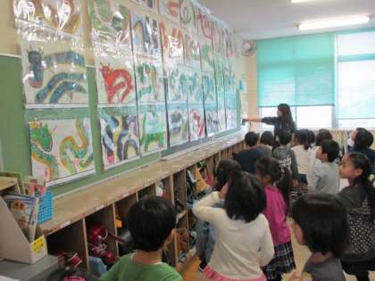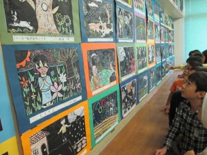 2時間目に全学年の児童が教室・講堂などをまわり、作品を鑑賞しました。「お兄ちゃん・お姉ちゃんの作品すごーい」「〇年の時、作ったなあ。うまいなあ」「こんなやり方もあるんだ」などお互いの作品を鑑賞しあうことで新たな発見もあり、刺激を受けているようすでした。【発信:教務 北風】