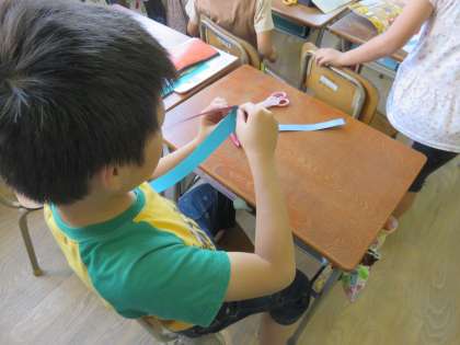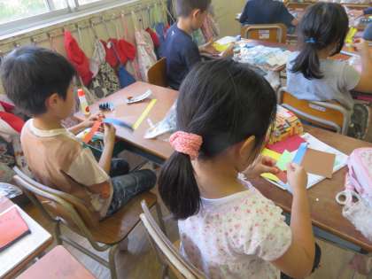 3年1組は図工科の学習で、色画用紙を使ってかざりづくりをしました。様々な色や大きさの画用紙を、まるめたり、おったり、切ったり、カールさせたりと色々な紙工作の技法を学んでいます。「カールさせたら花の形になったよ」「画用紙を重ねて折るときれいに見えるよ」など、子どもたちはいろいろ工夫しながら楽しそうに作っていました。     【発信:教務】