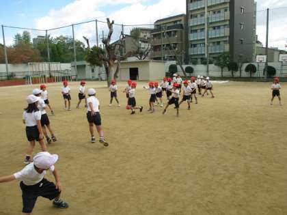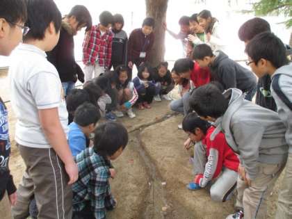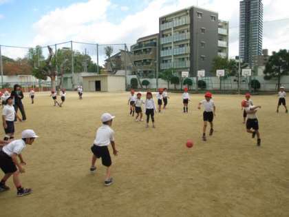 2時間目、運動場で5年生は理科「流れる水のはたらき」の実験を、1年生は転がしドッジボールをしました。