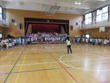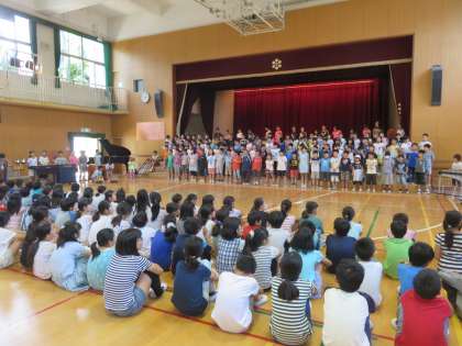 4年生と6年生は学年だよりに向けて合同で練習をしました。4年生は合奏「夏祭り」合唱「U&I」「太陽の歌」6年生は合奏「情熱大陸」合唱「Let's search for tomorrow」です。最後に4年生と6年生が一緒に「翼をください」を合唱します。講堂からは力強い合奏やきれいな合唱の歌声が響いていました。明日の5時間目に他学年の児童が鑑賞し、明後日の土曜授業では2時間目に発表します。【発信:教務】