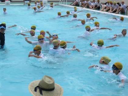 今日は、5・6年生の着衣泳がありました。3時間目は5年生が入り、体操服を着て歩いたり、ペットボトルを持って浮いたりしました。子ども達は、水を吸うと衣服が重くなって泳ぎにくいことを実感し、万が一の時の対処法を学びました。【発信:教務】
