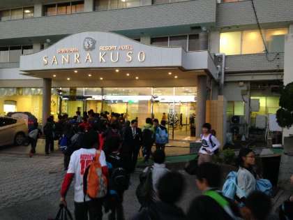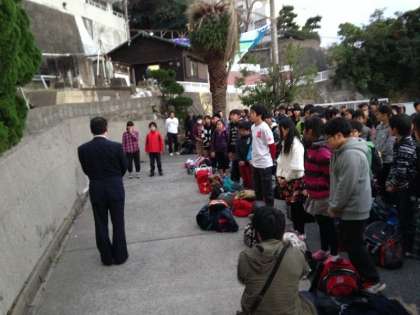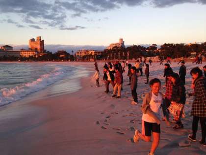16時半ごろ、白良浜に着きました。夕日をバックに学年写真を撮り、その後、三楽荘前で開舎式をしました。【発信:教務 北風】