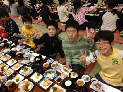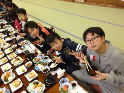 夕食は刺身やもずく酢、唐揚げなど盛りだくさんのメニューでした。【発信:教務 北風】
