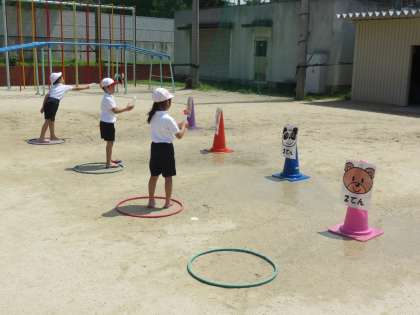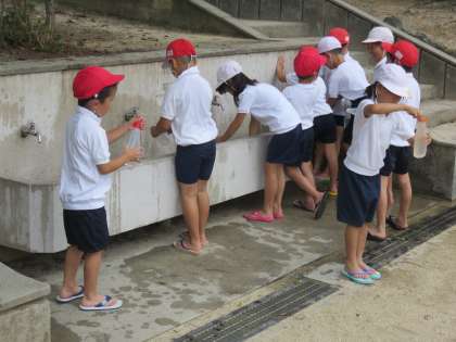 1年生は生活科の学習で水てっぽうで遊びました。ペットボトルやマヨネーズ・シャンプーの容器などに穴をあけて、水てっぽうをつくりました。子ども達は的にめがけて水をとばそうと何回も挑戦し、的にあたると「10点あたったよ」とうれしそうにしていました。【発信:教務】