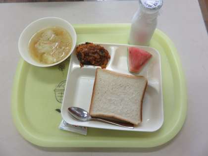今日の給食は「かぼちゃのミートグラタン・スープ・すいか・食パン・牛乳・りんごジャム」です。今月はオクラ・カボチャ・なす・トマト・冬瓜・冷凍みかん・アスパラガス・ゴーヤなどの旬の食材を使った給食が出ています。今日の給食に出たスイカは1年に1回しか出ないそうです。子どもたちに今日の給食にスイカが出るよと伝えると、「やったー」「うれしい」とみんな喜んでいました。【発信:教務】