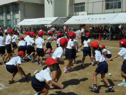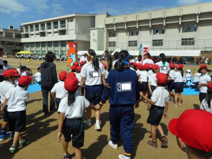 今日は高津中学校の体育祭に1年生が参加しました。中学校のお兄さん・お姉さんが持つカゴに玉を入れるゲームをしました。子ども達は夢中になって、カゴを追いかけていました。入場するときや競技中は中学校のお兄さん・お姉さんにやさしく声をかけてもらい、1年生はみんな楽しく過ごすことができました。【発信:教務】