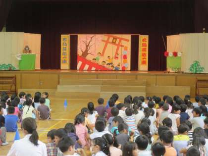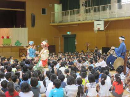 今日は観劇会がありました。「ひげのごん太のひげさわぎ」という題で、日本の伝統芸能狂言をもとに作られた演劇です。太鼓・カネ・三味線・横笛による生演奏、南京玉すだれや皿回しなどの大道芸、狂言が巧みに構成されており、何百年前も昔から演じ続けられている日本の伝統芸能狂言のおもしろさを分かりやすく伝える内容でした。 【発信:教務】