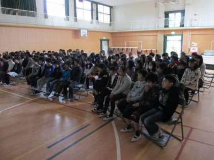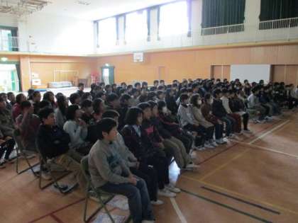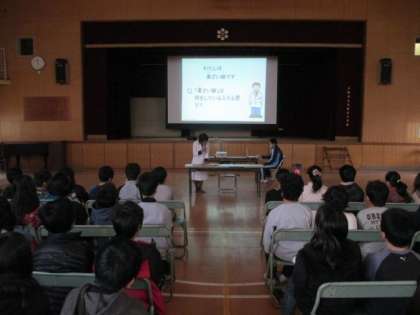 学校薬剤師の先生による薬の正しい使い方教室がおこなわれました。薬の正しい飲み方や副作用、薬物乱用の危険性などを中心にお話がありました。お茶で薬を飲むと色が変わる様子の実演もあり、子ども達は真剣に聞いていました。【発信:教務 北風】