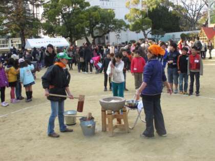 地域活動協議会主催のもちつき大会が行われました。児童・保護者・地域の方々・留学生など800名を超える参加がありました。7つのグループに分かれてもちつきをし、きな粉やしょうゆなどで味付けをして食べました。子ども達は杵を重そうにしながらも楽しそうにもちをつき、できたてのおもちや温かいぜんざいをおいしそうに食べていました。ご協力くださった保護者の皆様、各種団体の皆様本当にありがとうございました。【発信:教務 北風】