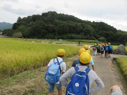 5年生は遠足で飛鳥・石舞台に行きました。飛鳥ではグループに分かれてオリエンテーリングをしました。オリエンテーリングでは「鬼の雪隠(せっちん)」「鬼のまな板」などの大きな石(古墳)や聖徳太子が生まれた場所だといわれる橘寺を通って石舞台まで行きました。行く途中には黄金色に輝く稲穂や柿がたくさん実り、子どもたちは秋を感じながらみんなで協力してオリエンテーリングをすることができました。