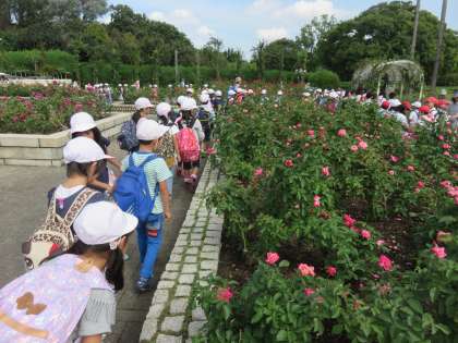 1年生は遠足で長居公園へ行きました。まず、大阪市立自然史博物館に行きました。自然史博物館は「身近な自然」「地球と生命の歴史」「生命の進化」「生き物のくらし」と題した4つの常設展示室があり、化石や標本がたくさん展示されています。その後、植物園の中にあるバラ園を散策し、お弁当を食べた後はどんぐりひろいをしました。天気もよく暑かったですが、子ども達は秋を感じながら、楽しく過ごすことができました。【発信:教務】