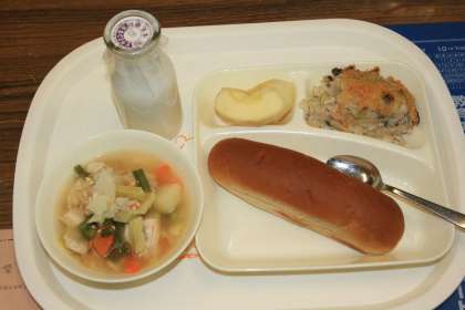 今日の給食は、鶏肉とじゃがいものスープ煮・きのこのドリア・りんご・パン・牛乳でした。今学期の給食も今日を合わせてあと4日となりました。後の写真は3年生の子ども達の給食時の様子です。【発信:教頭 八木】