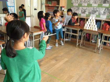 1・2時間目にゲーム集会がありました。1〜6年生まで縦割り班ごとに、ペットボトルボウリングやはてなボックス、まとあて、かんつみ、フリースローなど12種類のゲームを分担して、今日までにルールを考えたり、看板を作ったり準備をしてきました。ゲームは1年生から6年生がみんな楽しめるようにルールを工夫していました。縦割り班では6年生が中心となり、みんな楽しく活動することができました。【発信:教務】