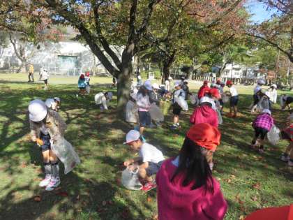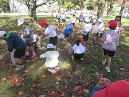 1年生は生活科の学習で落ち葉ひろいに行きました。学校裏の公園は落ち葉がいっぱいあり、子どもたちはたくさんひろうことができました。来週からひろった落ち葉を使って衣装を作ったり、おもちゃを作ったりします。【発信:教務】