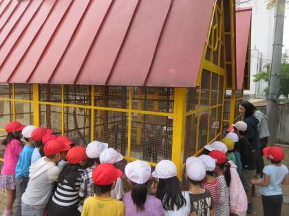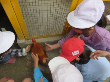 1年生は国語科で、身の回りの花や木、生き物などのようすを文章に書いて友だちに伝える学習をしています。今日は2組が飼育小屋のにわとり「キキ」を観察しました。子どもたちは「キキ」を触ってみて、「とさかが大きいね」「毛が気持ちいい」「鳴き声が聞けたね」と感想を言い合っていました。【発信:教務】