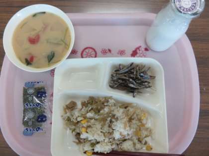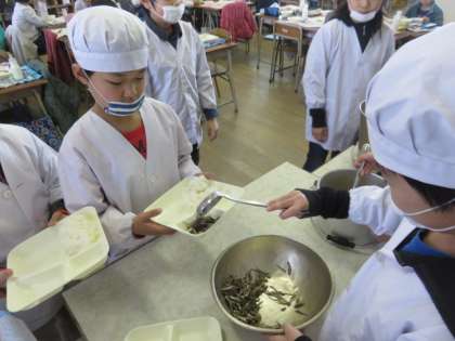 今日の給食のこんだては「きんぴらちらし・ぞうに・ごまめ・牛乳」です。「おせち料理には、新年を祝う気持ちやいろいろな願いをこめたものがたくさん入っています。ごまめはおせち料理の1つです。田作りとも言われ、昔、肥料としてかたくちいわしを田にまいたところ豊作になったことから、豊作を願う気持ちがこめられています。」(給食カレンダーより)
