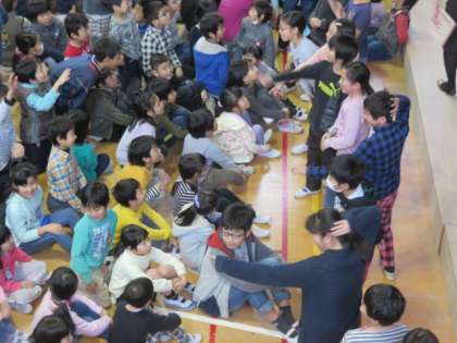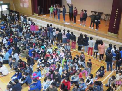 木曜集会の時間にジェスチャーゲームをしました。縦割り班ごとに集会委員が出すお題を見てジェスチャーをする子と、それを見て答えを考える子にわかれてゲームをしました。「アンパンマン」や「ドラえもん」などのお題が出て、ジェスチャーをするようすが楽しそうでした。今日が今年度最後の木曜集会でしたが、縦割り班でみんなが楽しめるようなゲームなどを毎回、集会委員会の児童が工夫して考えていました。【発信:教務】