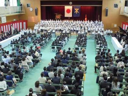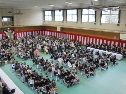 平成29年度入学式が行われました。154名全員の1年生が元気に参加することができました。入学式では学校長やPTA会長のお祝いのことば、担任の先生の紹介など、子どもたちは緊張しながらも、しっかりと話を聞くことができました。2年生のお迎えの演技では、「小さな世界」の合奏、校歌や「手をつなごう」の合唱などがあり、そこでは1年生も楽しく聞いていました。天気はあいにくの雨でしたが、無事に入学式を終えることができました。【発信:教務】